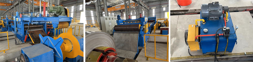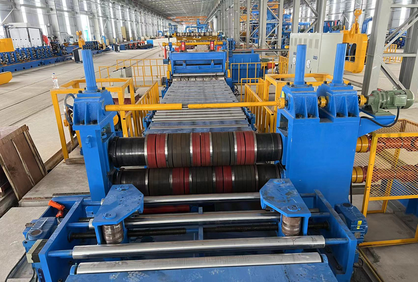 分條線(分條生產(chǎn)線) 該機(jī)組是將標(biāo)準(zhǔn)寬度鋼卷沿縱向切成一定尺寸的帶鋼并收卷成帶鋼卷筒,作為軋制、焊管、冷彎成型、沖壓成型等工序的原材料,更換不同材質(zhì)的刀具可分剪各種有色金屬帶材。